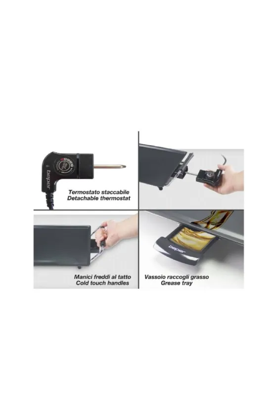5 selectable temperatures thanks to the practical removable thermostat. Complete with tray to collect grease and operating light. Ideal for cooking food naturally, without added fat and serving directly on the table.