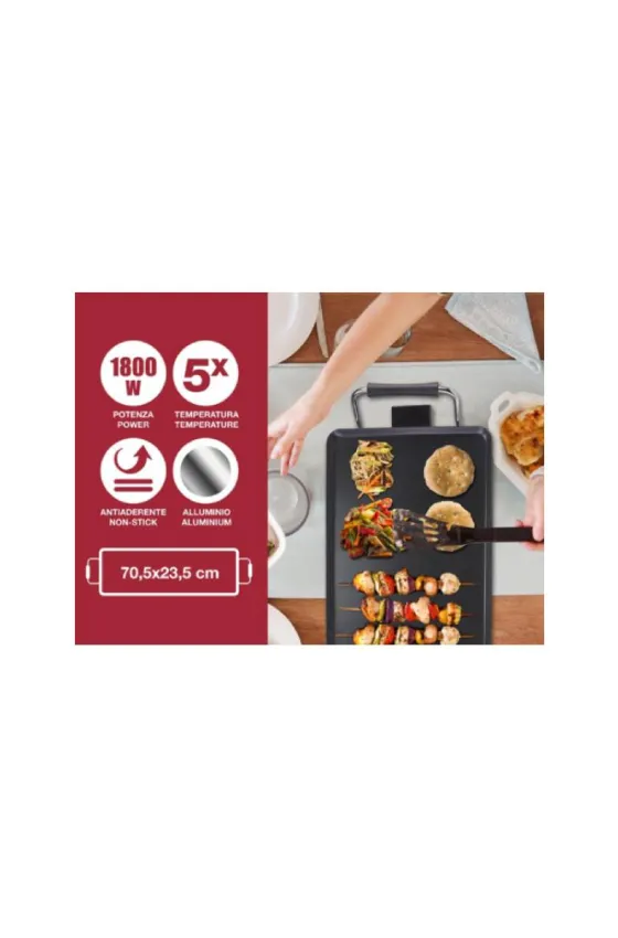Teppanyaki plate with a surface of 70.5x23.5cm with easy-to-clean non-stick coating and cool touch handles.