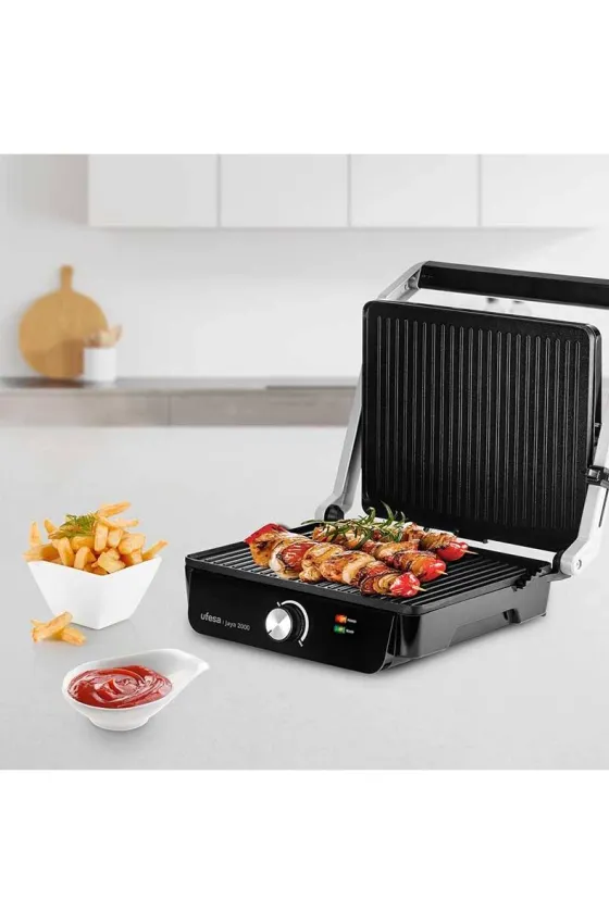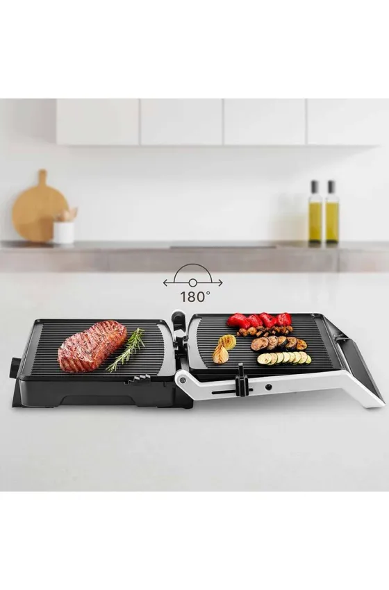 Contact Grill, 2000W, 180 opening, Cool touch safe handle, Adjustable temperature control knob, Power and Ready light indicator, Drip tray for collecting excess oil, Cord-warp for storage, Non-stick plates, Floating hinge system automatically adjusts to any size