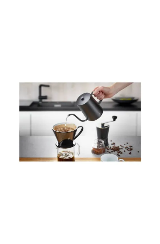 Whether you prefer aroma-enhancing and flavour-extracting blooming when brewing a cup of coffee or desire a cup of tea with just the right temperature control – this kettle with its gooseneck spout and a hole integrated in its lid for the insertion of a rod thermometer allows the best possible preparation of the specialities you ardently enjoy. Its black, matt-finished surface ensures that it will be an attractive eye-catcher in any kitchen.
