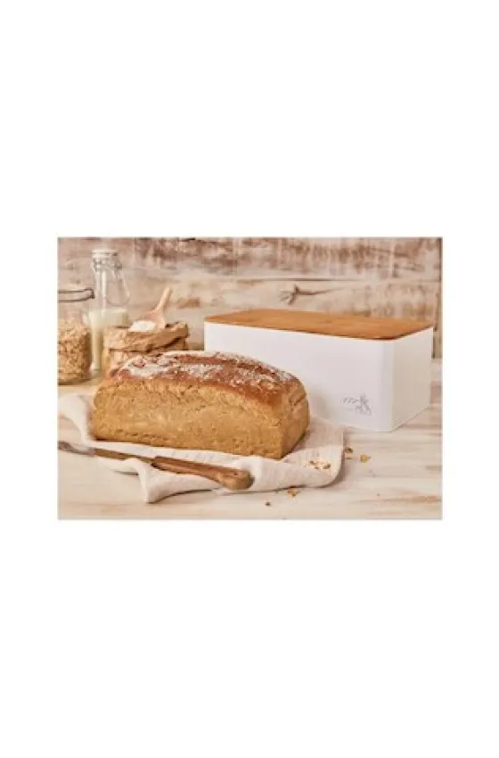 Bread bin ideal for keeping bread rolls, bread, toast, potatoes, onions, garlic and much fresher, made of food-safe metal, with 2-in-1 lid as chopping board, air circulation thanks to breathable bamboo wooden lid