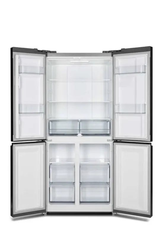 4 DOORS REFRIGERATOR, 420L, ENERGY CLASS A+, LED LIGHT, ECO DESIGN CONTROL PANEL, RECESSED HANDLE, SHELVES WITH ALUMINUM FRAME IN FRONT, INVERTER COMPRESSOR, R600A REFRIGERANT, BLACK GLASS