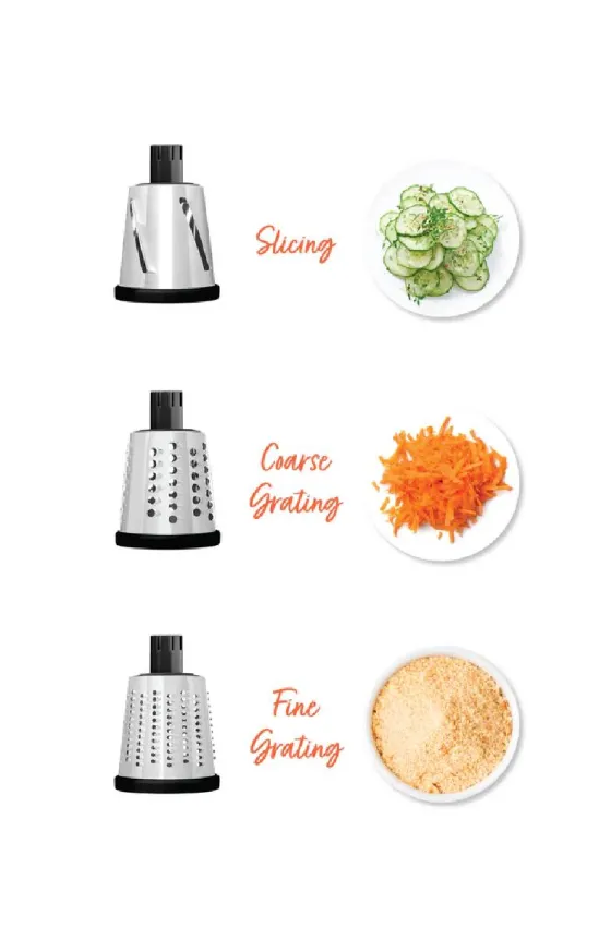 Enjoy total prep versatility with three interchangeable stainless steel drums that let you slice cucumbers, finely grate cheese, or coarsely shred vegetables—perfect for salads, garnishes, baking, and more.