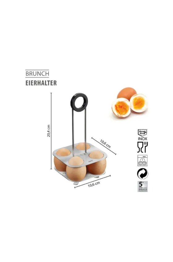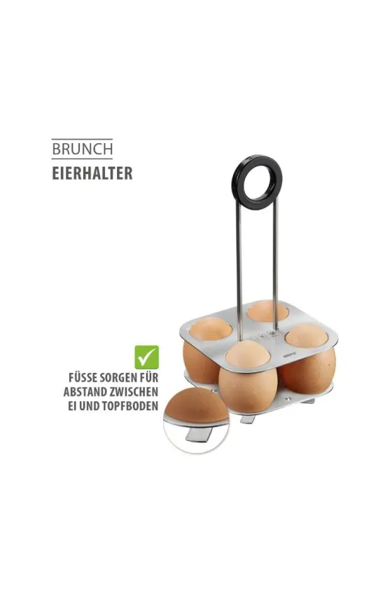 Two adjustable stainless steel plates hold four eggs of sizes S to XL safely in the pot while boiling. When they are done, just take the eggs out, move the upper plate down onto the lower one, put the eggs back and serve them! The stylish combination of stainless steel and the black plastic of the ring-shaped handle makes the egg stand a practical and beautiful table accessory. The egg stand can be used in pots of 12 cm diameter and above.