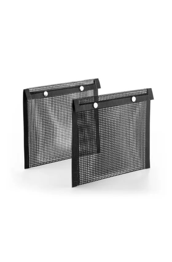 A set of 2 barbecue mesh bags, perfect for grilling vegetables and other small food items without them sticking or falling into the flames and burning. They are very practical and easy to use, you simply place the food in the bags and pit them on the barbecue grill (never directly onto the flames). The foods cook better and have a better flavour, since the smoke passes through the mesh. Simply turn the bags over to cook the other side. By being inside the bags, the foods don’t dispersed or fall into the fire while they are cooking, and once they are cooked they can be removed easily thanks to the non-stick material. The bags are alsoeasy to clean in the dishwasher. A more hygienic and effective way of cooking food on the barbecue.