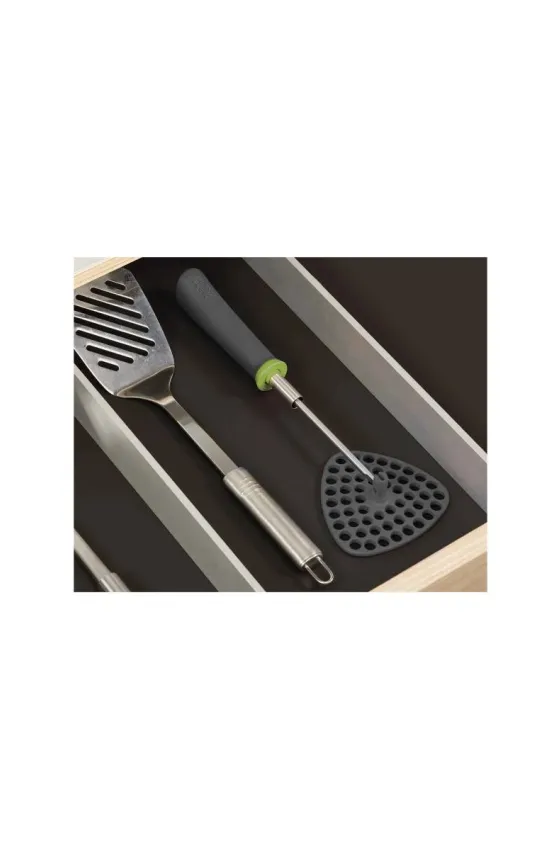 The Joseph Joseph Delta Green Potato Masher is a space-saving kitchen tool with a foldable design for easy storage. Its durable nylon mashing plate can be folded flat when not in use, making it a practical addition to any kitchen. This masher is designed to fit into curved pan edges, ensuring efficient mashing with ease.