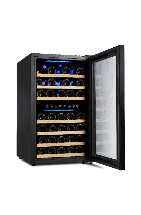 Featuring a dual-zone design, it offers a 45-bottle capacity with wood shelves to keep your bottles organized. The full glass front design provides a sleek, modern look, while the temperature control system ensures your wine is stored at the perfect temperature. Equipped with a high-efficiency compressor cooling system and fan cooling, this wine cooler operates quietly while maintaining optimal conditions. Its compact under-counter size (50*89*64cm) makes it ideal for kitchens or bars, adding both functionality and style to any space.